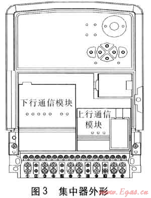 集中器外殼選用國(guó)家電網(wǎng)公司企業(yè)標(biāo)準(zhǔn)Q/GDW 375.2—2009《電力用戶用電信息采集系統(tǒng)型式規(guī)范:集中器型式規(guī)范》中的集中器外殼。外形見(jiàn)圖3。可以看到,這個(gè)外殼上面有上行通信模塊和下行通信模塊兩個(gè)小盒子,這兩個(gè)小盒子采用了可插拔設(shè)計(jì)。左邊小盒子是和采集器通信的通信模塊,右邊小盒子是和主站通信的通信模塊。集中器在設(shè)計(jì)時(shí)先規(guī)定好集中器和這兩個(gè)通信模塊之間的通信協(xié)議和物理層的接口,所有通信模塊的設(shè)計(jì)都遵守這個(gè)協(xié)議。根據(jù)現(xiàn)場(chǎng)選擇通信方式的不同更換不同的通信模塊,這樣就大大提高產(chǎn)品的適應(yīng)能力。