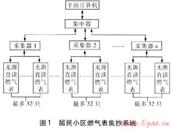 居民小區(qū)燃?xì)獗砑到y(tǒng)見(jiàn)圖1。系統(tǒng)由3部分組成,即燃?xì)獗怼⒓O(shè)備和主站。與傳統(tǒng)方式不同的是集抄設(shè)備不再是集中器一種設(shè)備,而是由集中器和采集器組成。集中器每天或每月輪抄1遍所轄的燃?xì)獗?,這個(gè)過(guò)程需要通過(guò)采集器轉(zhuǎn)發(fā)配合完成。集中器把數(shù)據(jù)保存在儲(chǔ)存器中然后等待主站發(fā)命令讀取。主站每天或每月定時(shí)讀取集中器內(nèi)的數(shù)據(jù),也可以通過(guò)集中器和采集器實(shí)時(shí)地讀取燃?xì)獗淼臄?shù)據(jù)。這個(gè)系統(tǒng)中燃?xì)獗磉x用無(wú)源直讀燃?xì)獗怼?/span>