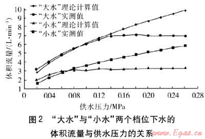 ② 在相同供水壓力下,“大水”檔位的體積流量較大,主要是因為“大水”檔位的局部阻力比“小水”檔位的局部阻力小,即水量調(diào)節(jié)閥是通過調(diào)節(jié)局部阻力來調(diào)節(jié)流量的。