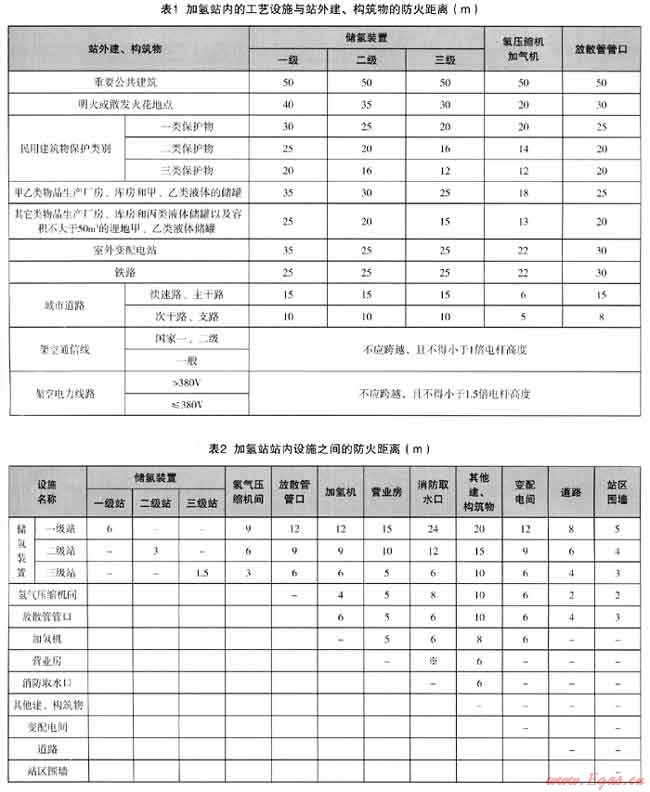 加氫站是甲類火災(zāi)危險(xiǎn)眭設(shè)施,必須在設(shè)計(jì)上保證其安全可靠。在加氫站進(jìn)行站址選擇和站內(nèi)建、構(gòu)筑物及設(shè)備平面布局設(shè)計(jì)時(shí),必須符合上海市城市規(guī)劃和站區(qū)防火安全的要求,參照上海市地方規(guī)范《燃料電池汽車加氫站技術(shù)規(guī)程》,確保加氫站與站外重要公共建筑物、明火或散發(fā)火花地點(diǎn)、民用建筑和廠房、庫(kù)房、儲(chǔ)罐、鐵道、鐵路、架空通信線、架空電力線路等保持足夠的防火距離滿足表1的要求。