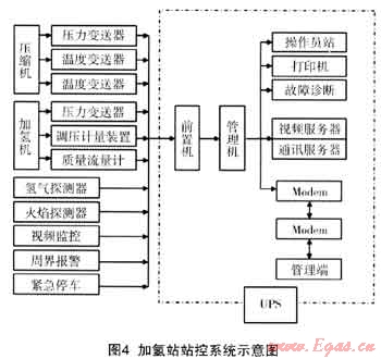 站控制系統(tǒng)采用分布、分級(jí)的控制方式,分散控制、集中管理,整個(gè)加氫站的站控系統(tǒng)由兩級(jí)計(jì)算機(jī)組成。前置機(jī)(下位機(jī))負(fù)責(zé)實(shí)時(shí)數(shù)據(jù)的采集功能;管理機(jī)(上位機(jī))用于完成數(shù)據(jù)信號(hào)接受處理、顯示、記錄、控制和數(shù)據(jù)上傳。在控制室集中顯示加氫站內(nèi)所有檢測(cè)儀表、閥門狀態(tài)、可燃?xì)怏w檢測(cè)等信號(hào)的監(jiān)測(cè),以及對(duì)閥門實(shí)現(xiàn)自動(dòng)控制。站控系統(tǒng)可監(jiān)視、控制整個(gè)加氫站運(yùn)行的全過(guò)程,計(jì)算所需的技術(shù)參數(shù),自動(dòng)繪制參數(shù)的實(shí)時(shí)和歷史趨勢(shì)曲線。對(duì)站區(qū)采集的數(shù)據(jù)包括卸氣系統(tǒng)、增壓系統(tǒng)、儲(chǔ)氫系統(tǒng)、可燃?xì)怏w檢測(cè)系統(tǒng)、火焰探測(cè)系統(tǒng)、視頻監(jiān)控系統(tǒng)及加氣系統(tǒng)等所有數(shù)據(jù)。
