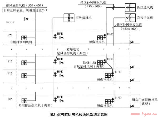 (1) 廚房的機(jī)械補(bǔ)風(fēng)系統(tǒng)可設(shè)置為低區(qū)和高區(qū),低區(qū)從5層到16層,高區(qū)從17層到28層,低區(qū)和高區(qū)各負(fù)責(zé)12層。低區(qū)和高區(qū)的排油煙豎井(采用550×450成品風(fēng)道)合用,低區(qū)和高區(qū)的事故排風(fēng)豎井也是高、低區(qū)合用。