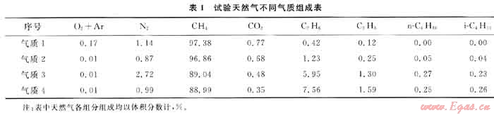 為了考察不同氣質(zhì)天然氣組成條件對部分氧化反應的影響,選擇了4種氣質(zhì)條件進行試驗,其組成分別如表1所示。