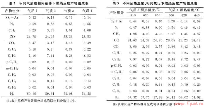 為了考察不同氣質(zhì)對燃燒反應的影響,所有試驗樣品在相同工況下進行反應:天然氣流量為4700m3/h,預熱溫度為625℃,氧比為0.575,熱淬火水用量為39m3/h,冷淬火水用量為35m3/h。