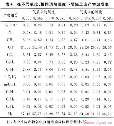 從表2也可以看出,在相同反應條件下,隨著從氣質(zhì)1至氣質(zhì)4有機碳總量的增加,裂化產(chǎn)物中乙炔含量不斷增加,而剩余甲烷含量并未減少,反而呈增加趨勢,這也說明了在相同耗氧量的情況下,氣質(zhì)4裂解生成乙炔的能力更高。但另一方面也可以看出,裂解產(chǎn)物中合成氣(H2+CO)含量在減少,這也充分說明了乙炔產(chǎn)量的增加是以合成氣的減少為代價的。