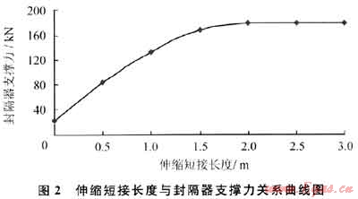 封隔器安全坐封力為9.07t,而壓裂時(shí)坐封力為21.1kN,小于封隔器安全坐封力,同時(shí)封隔器對套管作用力達(dá)460.26kN。元壩2井事故分析結(jié)果為:施工中封隔器承受上頂力較大,膠皮密封不嚴(yán),存在柒性竄漏,同以上理論計(jì)算結(jié)果相符合。因此,采用本研究方法設(shè)計(jì)伸縮短接,針對管柱受力最惡劣的擠酸工況,采用不同伸縮短接長度對封隔器支撐力進(jìn)行敏感性分析,分析結(jié)果如圖2所示。
