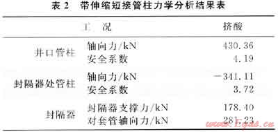通過以上敏感性分析,設(shè)計(jì)1.7m伸縮短接便可有效補(bǔ)償擠酸工況管柱變形附加力。以下對安裝伸縮短接后的管柱進(jìn)行力學(xué)分析和強(qiáng)度校核,結(jié)果見表2。