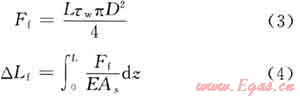 對于帶封隔器井下管柱,隨著井筒壓力、溫度等參數(shù)變化而產(chǎn)生溫度效應(yīng)、活塞效應(yīng)、鼓脹效應(yīng)、螺旋彎曲效應(yīng)。對這4個(gè)基本效應(yīng)產(chǎn)生的管柱變形及其變形力,國內(nèi)外學(xué)者已經(jīng)做了大量研究,此不贅述。對于深層氣井,高速擠酸過程中,流體粘滯摩阻效應(yīng)是引起管柱變形的重要因素,也是造成管柱、封隔器失效的主要原因。因此,在分析管柱變形時(shí)除了要考慮上述4種基本效應(yīng)外,還必須考慮流體粘滯摩阻效應(yīng),粘滯摩阻力(Ff)和摩阻效應(yīng)變形(△Lf)分別由下式表示[7~8]: