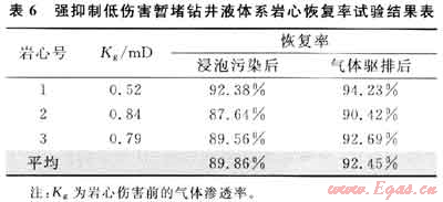 為驗證現(xiàn)場完井液對儲層的傷害程度,模擬現(xiàn)場實際鉆井過程,測定鄰井的3塊巖心經(jīng)48h動態(tài)、48h靜態(tài)傷害前后及高壓氣體反向驅(qū)排后的滲透率并計算巖心的恢復(fù)率(表6)。