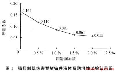 選用不同種類潤滑劑和體系進行配伍試驗,最終篩選出潤滑劑WY-1。由圖1可以看出:摩阻系數(shù)隨潤滑劑WY-1加量的增加而降低,加量超過1.50后趨于穩(wěn)定。加量在1.5%時,潤滑系數(shù)降低率可達到62.8%。因此,推薦WY-1加量為1.5%。