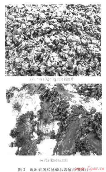 1) 鉀鹽聚磺鉆井液體系具有良好的抑制防塌性能。在斜井段施工過程中,該鉆井液體系從鉀離子的防塌性、無機鹽降低水相滲透壓、聚磺的抑制封堵等3個方面增強了鉆井液體系的抑制防塌能力,返出“雙石層”巖屑形狀規(guī)則,沒有出現(xiàn)水化或分散跡象,捻碎后巖屑內(nèi)部呈干態(tài),有效防止了PDC鉆頭泥包(圖2)。