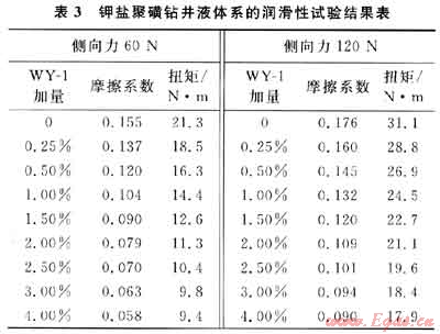采用上述鉆井液配方,改變潤滑劑WY-1的加量,借助DA-11動態(tài)模擬潤滑儀測其在不同側(cè)向力條件下的摩擦系數(shù)和扭矩,觀察在不同側(cè)向力下體系的潤滑性能,結(jié)果見表3。