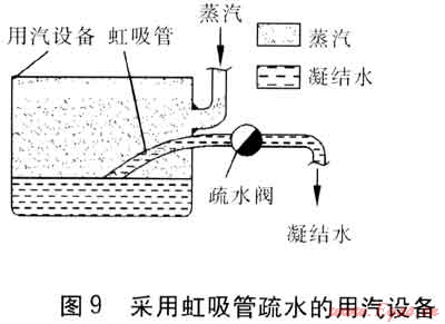 采用虹吸管疏水時(shí)(見(jiàn)圖9),用汽設(shè)備中的凝結(jié)水由蒸汽推動(dòng)進(jìn)入疏水管道,因此凝結(jié)水易與蒸汽一同進(jìn)入疏水閥,導(dǎo)致蒸汽鎖的產(chǎn)生。這時(shí)可通過(guò)使用蒸汽鎖釋放閥來(lái)釋放部分蒸汽,確?;煊姓羝哪Y(jié)水能夠無(wú)阻礙地連續(xù)流入疏水閥[7~8]。