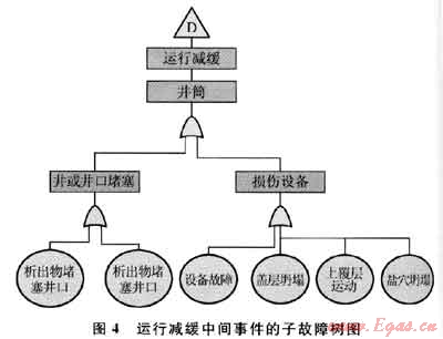 1) 建立故障樹,以地下儲氣設(shè)施失效作為頂事件,而泄漏和注采能力下降作為次級事件(如圖3所示),圖3中的A、B、C、D則分別表示泄漏到大氣、通過地層泄漏、運行中斷和運行減緩中間事件,并可進一步建立子故障樹,圖4為運行減緩中間事件的子故障樹。