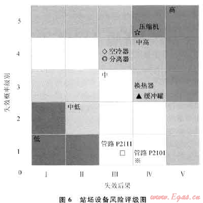 2) 注采氣站風(fēng)險評估結(jié)果表明:壓縮機系統(tǒng)和處理系統(tǒng)風(fēng)險遠(yuǎn)遠(yuǎn)大于管路系統(tǒng)風(fēng)險,其中壓縮機組最大;處理系統(tǒng)設(shè)備中空冷器風(fēng)險最大,其次是緩沖罐(壓縮機出口)、過濾分離器和旋流分離器(圖5);而管路系統(tǒng)中對帶壓的34條管線中,從壓縮機出口到緩沖罐出口的管線P2112~P2118風(fēng)險最大,其中P2113最大,管路系統(tǒng)風(fēng)險值大主要是由于壓力和溫度相對較高引起的。采用風(fēng)險矩陣對各類設(shè)備或管路風(fēng)險定級可知:壓縮機風(fēng)險為高風(fēng)險,而管路系統(tǒng)均為中低風(fēng)險(圖6)。通過風(fēng)險排序,明確了高風(fēng)險單元,即可采用HAZOP法進行詳細(xì)風(fēng)險分析。