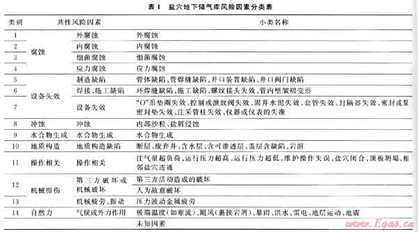 通過對地下溶腔、注采管柱、注采井口、天然氣處理系統(tǒng)、壓縮機組、工藝管路和地面集輸管線7個子單元的工作過程系統(tǒng)分析,并結(jié)合事故原因統(tǒng)計分析結(jié)果和借鑒管道風(fēng)險因素歸類方法,確定了鹽穴地下儲氣庫風(fēng)險,包括腐蝕、設(shè)備失效、沖蝕、水合物生成、地質(zhì)構(gòu)造、操作相關(guān)、機械損傷以及自然力8類共性風(fēng)險,可細(xì)分為14大類和45小類風(fēng)險因素(表1)。