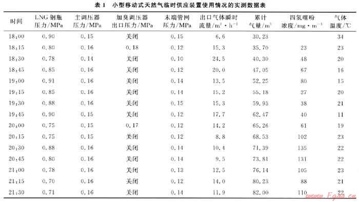 采用小型移動(dòng)式天然氣臨時(shí)供應(yīng)裝置為5棟28層的高層樓宇供氣,每套調(diào)壓加臭箱備有4個(gè)LNG鋼瓶重瓶,表1為該裝置晚間高峰用氣時(shí)段(18:00-21:30)為其中一棟樓宇236戶居民用戶供氣情況的實(shí)測(cè)數(shù)據(jù)(每隔15min記錄1次)。