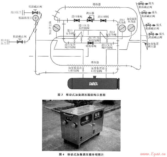 根據(jù)以上分析可知,由于LNG鋼瓶組為現(xiàn)成的外接設(shè)備,小型移動(dòng)式天然氣臨時(shí)供應(yīng)裝置的設(shè)計(jì)關(guān)鍵就是集增熱、調(diào)壓及加臭于一體的橇裝設(shè)備的設(shè)計(jì),這里將其定義為移動(dòng)式加臭調(diào)壓箱,其結(jié)構(gòu)示意圖如圖3所示。