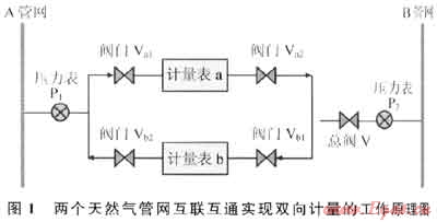 在兩個(gè)天然氣管網(wǎng)(A、B)聯(lián)通處的兩側(cè)分別設(shè)置用于測量管網(wǎng)實(shí)際運(yùn)行壓力的壓力表(P1、P2),同時(shí)設(shè)置兩個(gè)方向相反的單向計(jì)量通道:A管網(wǎng)通過計(jì)量儀表a向B管網(wǎng)補(bǔ)充天然氣;B管網(wǎng)通過計(jì)量儀表b向A管網(wǎng)補(bǔ)充天然氣。