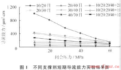 20/40目陶粒與20/40目石英砂按2:1(體積比)混合后,在52MPa下導流能力較低,主要是石英砂抗壓強度不夠,在52MPa下破碎率過高造成。