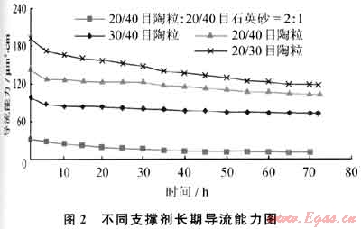 室內取閉合壓力52MPa,以蒸餾水為驅替介質,按照10.0kg/m2濃度鋪設支撐劑,室溫下評價了幾種不同規(guī)格陶粒和復合組合支撐劑的長時間導流能力。實驗結果如圖2所示。