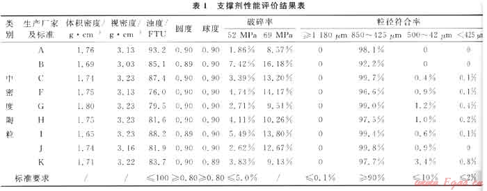 依據行業(yè)標準SY/T 5108—2006《壓裂支撐劑性能指標及測試推薦方法》相關規(guī)定,對現(xiàn)場抽取的9家(種)支撐劑樣品進行了分類性能評價,結果見表1。