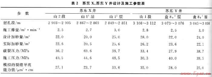 蘇東Y井儲層壓裂裂縫閉合應力預計在50.0MPa左右,選用20/30目陶粒。該井盒8下1層上下隔層應力遮擋好,砂體較厚并有小隔層,因此設計排量應適當加大,以滿足對儲層兩個段都進行有效改造,設計裂縫導流能力為25μm2·cm;盒8下2層上下隔層應力遮擋好,且砂體較厚有12.2m,因此設計砂量和砂比綜合考慮滿足儲層物性對導流能力的需求就可,設計裂縫導流能力為28μm2·cm;山1段有效氣層厚度為12.5m,砂體厚度相對較大,適當加大施工規(guī)模以增強氣層段裂縫的有效支撐,設計裂縫導流能力為35μm2·cm。