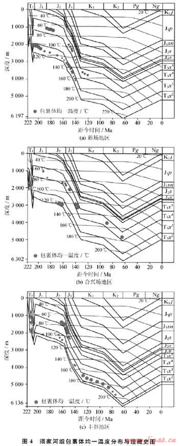 從單井包裹體均一溫度和埋藏史分析結(jié)果可以看出,孝泉-豐谷構(gòu)造帶大致存在2期成藏,早期為液態(tài)烴充注,晚期為天然氣充注,液態(tài)烴須二段成藏期為T3x5-J1,須四段成藏期為J1-J2早期。氣態(tài)烴成藏時(shí)間較晚,不同地區(qū)不同層段油氣充注的時(shí)間不盡相同。新場(chǎng)地區(qū)須四段主要成藏期從J3開始成藏,持續(xù)至K1中期,須二段成藏期為J2中期-K1早期(圖4-a);合興場(chǎng)地區(qū)(包括高廟子地區(qū))須四段主成藏期為J2末期-K1早期,須二段成藏期為J2中晚期(圖4-b);豐谷地區(qū)須四段主要成藏期為J2末期-J3中期,須二段成藏期為J2中期-K期均有連續(xù)充注(圖4-c)。