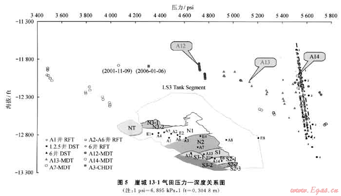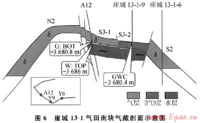由于陵三段儲(chǔ)層厚,氣柱高度大,一直被認(rèn)為是具統(tǒng)一氣水邊界的均一氣藏。但氣田范圍內(nèi)發(fā)育許多斷層,因斷距較小,斷層的封堵性常未引起重視。隨著十幾年的持續(xù)開發(fā),氣田的動(dòng)靜儲(chǔ)量差別較大。在構(gòu)造南塊S3-1高部位的A12井,竟然在主力氣層出現(xiàn)水層,其氣水界面高出“統(tǒng)一”氣水界面276m,令所有研究者十分困惑。通過對(duì)該井壓力資料進(jìn)行分析,A12井區(qū)北側(cè)斷層Y3隨著生產(chǎn)壓力下降而開啟,開井時(shí)地層壓力系數(shù)只有0.7。為進(jìn)一步挖掘與S3-1相鄰的S3-2的儲(chǔ)量,又鉆了Y9井,結(jié)果更令人費(fèi)解,只鉆遇薄氣層及厚水層,與S3-2東側(cè)低部位的Y6井矛盾,因?yàn)閅6井無水層。經(jīng)小層對(duì)比,儲(chǔ)層橫向變化不大且斷層并不能斷開儲(chǔ)層段。