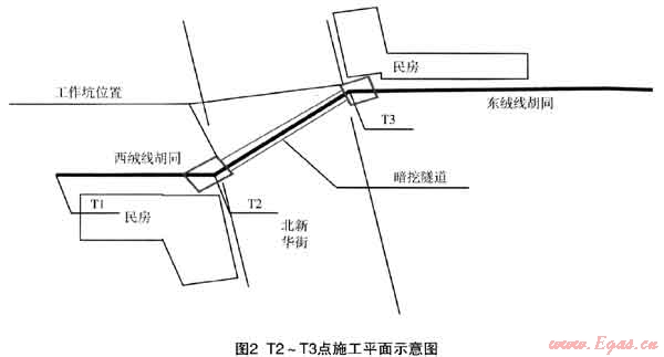 由于2008年為奧運(yùn)年,北新華街及西絨線胡同剛剛重新修整完畢,根據(jù)市交管局要求不得破路施工。因此,整體工程T1~T3點(diǎn)采用非開挖施工,T3~T4點(diǎn)采用明開挖施工。