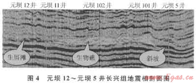 元壩地區(qū)長(zhǎng)興組某方向的地震剖面(圖4)顯示地震相特征主要表現(xiàn)為臺(tái)地邊緣淺灘相、臺(tái)地邊緣生物礁相及礁前斜坡相,與測(cè)井相所反映的沉積特征一致。臺(tái)地邊緣生物礁為“低頻、弱振幅、內(nèi)部雜亂、透鏡狀反射結(jié)構(gòu)”地震相特征[7],一般外形上頂部上拱隆起形成披蓋構(gòu)造和側(cè)面上超形態(tài),呈丘狀,這與臺(tái)地邊緣生物礁沉積體的“含弱反射的隆起”特征類似,為典型生物礁沉積特征,如元壩102、元壩101井區(qū)地震相沉積特征。臺(tái)地邊緣淺灘,常發(fā)育碎屑灘,這些碎屑顆粒往往是由海浪拍打生物礁形成的,地震剖面上呈“斷續(xù)、斜交、中強(qiáng)振幅反射”的地震相特征,如元壩12、元壩11井井區(qū)為礁后淺灘沉積特征。臺(tái)地邊緣往陸棚過渡,水動(dòng)力條件逐漸減弱,巖性泥質(zhì)含量增多,反射波組呈平行、亞平行反射,并有同相軸增多現(xiàn)象,如元壩5井井區(qū)為礁前斜坡沉積特征。