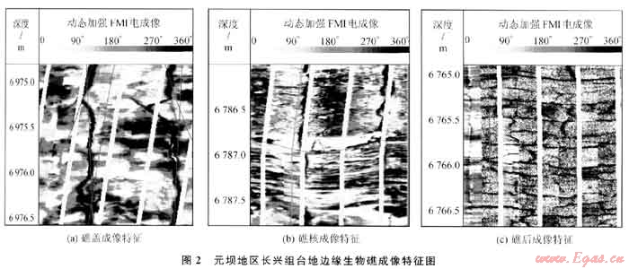 研究區(qū)大部分井都已取全取準(zhǔn)了成像測(cè)井資料,利用成像測(cè)井對(duì)元壩地區(qū)長(zhǎng)興組礁灘相儲(chǔ)層的沉積微相做進(jìn)一步刻畫顯得尤為重要。通過對(duì)本區(qū)鉆井的成像測(cè)井信息與沉積微相的地質(zhì)信息進(jìn)行對(duì)比分析表明,礁蓋、礁核是最有利于元壩長(zhǎng)興組礁灘相優(yōu)質(zhì)儲(chǔ)層發(fā)育的沉積微相。