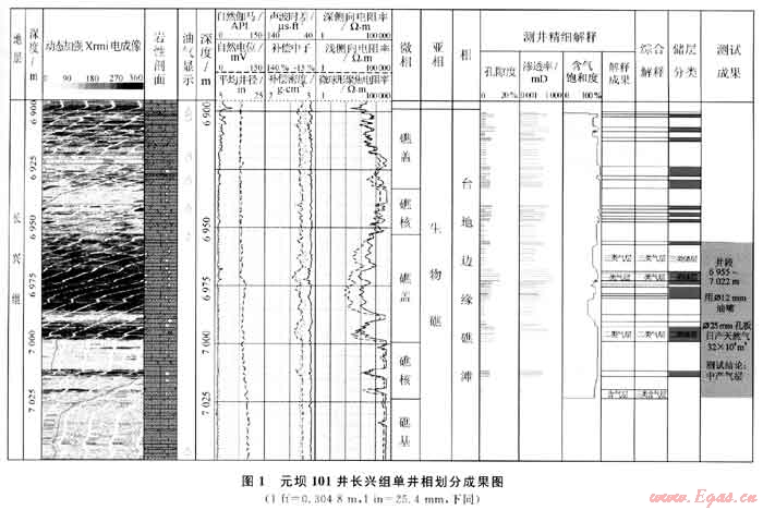 在區(qū)域地質(zhì)背景分析的基礎(chǔ)上,綜合利用成像測(cè)井、常規(guī)測(cè)井及巖屑薄片鑒定等資料,結(jié)合實(shí)際鉆探成果進(jìn)行了研究區(qū)長(zhǎng)興組的單井相劃分。以元壩101井單井相劃分為例(圖1),圖中顯示該段地層自然伽馬低值,約10API,巖性純,以淺灰色白云巖、溶孔白云巖及生屑灰?guī)r為主,夾有云質(zhì)灰?guī)r和含云灰?guī)r;成像圖像上可見6900~6925m和6950~7000m裂縫及溶蝕孔洞非常發(fā)育,對(duì)應(yīng)的孔隙度曲線明顯增大,儲(chǔ)集物性好,電阻率曲線較致密圍巖明顯降低,呈大幅度正差異特征,儲(chǔ)層滲透性好。這些特征反映當(dāng)時(shí)的沉積水體相對(duì)較淺,沉積水體能量較強(qiáng),白云巖化作用較強(qiáng),易形成溶蝕孔洞白云巖儲(chǔ)層,為臺(tái)地邊緣生物礁儲(chǔ)層沉積特征。取心資料顯示,該井段含有大量生物碎屑,這些生屑多為有孔蟲類、腕足類及鰱的化石,而這些生物正是區(qū)域上長(zhǎng)興組沉積時(shí)期生物礁的附礁生物[2];結(jié)合研究區(qū)所有單井的長(zhǎng)興組沉積相分析結(jié)果,綜合認(rèn)為該地層屬于臺(tái)地邊緣礁灘相沉積。