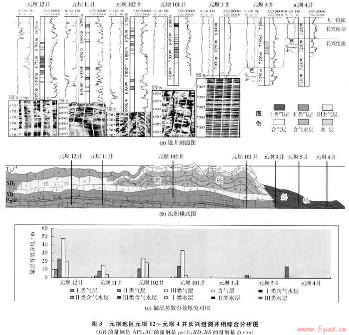 曲線特征及連井相對(duì)比分析表明,不同的沉積相帶測(cè)井特征存在較大差異(圖3),元壩12、元壩11井長(zhǎng)興組自然伽馬平均值為15API,巖性為淺灰色生屑灰?guī)r、深灰色含云生屑灰?guī)r,儲(chǔ)集物性較好,成像圖上裂縫及溶蝕孔洞發(fā)育,取心見鰱類化石、海綿骨針、苔蘚蟲、有孔蟲等,測(cè)井相為臺(tái)地邊緣礁灘相,亞相為礁后淺灘,有利于儲(chǔ)層發(fā)育的沉積微相為生屑灘和砂屑灘.元壩102、元壩101井長(zhǎng)興組自然伽馬平均值為10API,巖性以白云巖、灰質(zhì)云巖及云質(zhì)灰?guī)r為主,儲(chǔ)集物性好,成像圖上高角度縫、網(wǎng)狀縫及溶蝕孔洞發(fā)育,取心見孔蟲類、腕足類及筵的化石等,測(cè)井相為臺(tái)地邊緣礁灘相,亞相為生物礁,具有利于儲(chǔ)層發(fā)育的礁蓋和礁核沉積微相特征;而過渡到元壩3~元壩4井長(zhǎng)興組自然伽馬逐漸增大,平均值由21API增加至27API,泥質(zhì)含量相對(duì)較重,巖性以含泥灰?guī)r為主,儲(chǔ)集物性差,成像圖上層理發(fā)育,儲(chǔ)層不發(fā)育,其測(cè)井相為斜坡-淺水陸棚沉積[6]。同時(shí),儲(chǔ)層參數(shù)橫向?qū)Ρ?圖3-c)反映元壩12~元壩101井儲(chǔ)層發(fā)育,儲(chǔ)集物性好,以Ⅱ、Ⅲ類儲(chǔ)層為主,儲(chǔ)層含氣性好,測(cè)試獲得天然氣產(chǎn)能為30×104~120×104m3/a,可能為臺(tái)地邊緣礁灘相沉積特征。