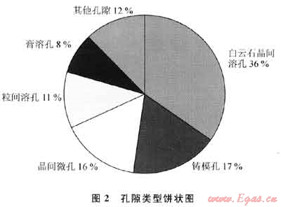 根據(jù)巖心鑄體薄片、電鏡掃描分析,Asmari組孔隙類(lèi)型豐富多樣,以次生孔隙為主;原生孔隙極少,在成巖作用過(guò)程中幾乎破壞殆盡。孔隙主要為晚期溶蝕作用形成的白云石晶間溶孔、粒屑鑄??住⒘ig及粒內(nèi)溶孔、膏溶孔或膏???。其中,白云石晶間溶孔,生屑、砂屑等碳酸鹽巖粒屑被溶蝕或選擇性溶蝕形成的鑄??住⒘?nèi)或粒間溶孔以及膏溶孔等,分別占各類(lèi)孔隙的36%;白云石、少量方解石的晶間微孔占16%;粒間孔、粒內(nèi)孔、生屑體腔孔、殼壁孔等原生孔隙以及其他類(lèi)型的孔隙僅占12%(圖2)。