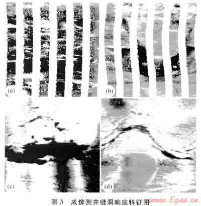 根據(jù)溶洞的分布特征及與孔、縫間的關(guān)系,可分為孔隙性溶洞和裂縫性溶洞。孔隙性溶洞即溶洞是溶孔被進(jìn)一步溶蝕擴(kuò)大后形成(圖3-a),這些溶洞周?chē)C芗植既芸?,孔、洞也常呈層狀分布,相互間連通性好;裂縫性溶洞即溶洞是構(gòu)造縫及少量成巖壓溶縫被局部溶蝕擴(kuò)大形成的,溶洞常沿裂縫呈串珠狀或長(zhǎng)條狀分布,縫、洞連通性好(圖3-b、c、d)。以小型溶洞為主,占82%,中型溶洞占13%,大型溶洞占5%。在白云巖層段中、小型溶洞相對(duì)發(fā)育,而在石灰?guī)r層段大型溶洞發(fā)育。在EMI測(cè)井剖面中,大型溶洞的高度可達(dá)0.5m。在鉆井中常出現(xiàn)鉆時(shí)降低、放空、井漏顯示,如某井放空0.3m,EMI測(cè)井反映溶洞特征明顯(圖3-c)。在不同的構(gòu)造部位,溶}同的發(fā)育程度差異明顯,V3井區(qū)Zone1-Zone2的溶洞層段明顯比V1、V2井區(qū)發(fā)育,厚度為V1、V2井的1.5~2.0倍,表明從構(gòu)造的西南段向東北段溶蝕作用有減弱的趨勢(shì)。同時(shí),據(jù)巖石學(xué)特征、溶蝕孔洞內(nèi)幾乎沒(méi)有充填以及溶孔、溶洞與裂縫的密切關(guān)系,認(rèn)為溶蝕作用是在構(gòu)造裂縫形成之后發(fā)生的。
