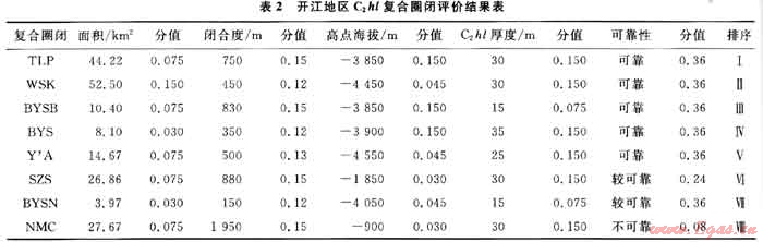 C2hl及其上、下巖層的組合是四川盆地多套生、儲蓋組合中較好的一套組合,經(jīng)過多年的勘探也證實C2hl具有豐富的天然氣資源。結(jié)合已發(fā)現(xiàn)C2hl氣藏特征對已識別C2hl復(fù)合圈閉面積進(jìn)行劃分,圈閉面積小于10km2的權(quán)值取0.2,圈閉面積大于50km2的取權(quán)值1.0,圈閉面積介于10~50km2的取權(quán)值0.5,圈閉面積評價系數(shù)權(quán)重為O.15(表1)。