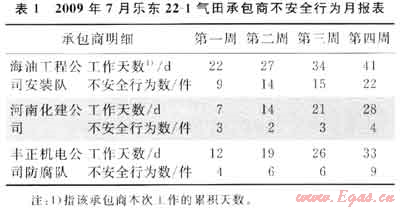 承包商安全績(jī)效考核機(jī)制有利于規(guī)范承包商的行為。自2010年樂(lè)東22-1氣田對(duì)承包商安全績(jī)效監(jiān)控機(jī)制實(shí)施以來(lái),承包商遵守安全規(guī)章制度和安全操作程序的意識(shí)有顯著提高,違規(guī)行為不斷下降。2010年1—11月共有91項(xiàng)承包商作業(yè),無(wú)可記錄傷害事件發(fā)生。