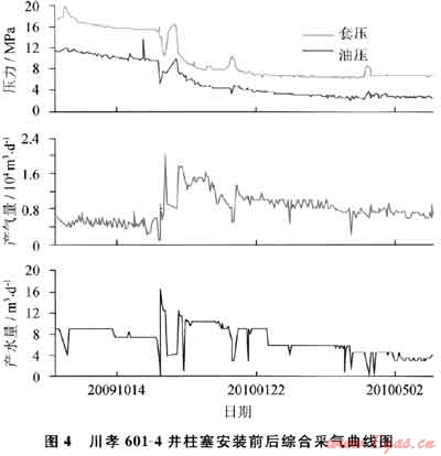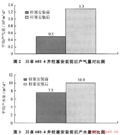 川孝601-4井施工前產(chǎn)氣0.5×104m3/d,產(chǎn)水7.5m3/d;施工后產(chǎn)氣1.3×104m3/d,產(chǎn)水10m3/d,增產(chǎn)天然氣0.8×104m3/d,排水采氣效果顯著。綜合采氣曲線可以看出:該井自安裝柱塞氣舉以來(lái),油套壓差減小,產(chǎn)氣量顯著增加,排水采氣效果明顯。柱塞氣舉安裝前后產(chǎn)量對(duì)比如圖2、3所示,柱塞安裝前后綜合采氣曲線如圖4所示。