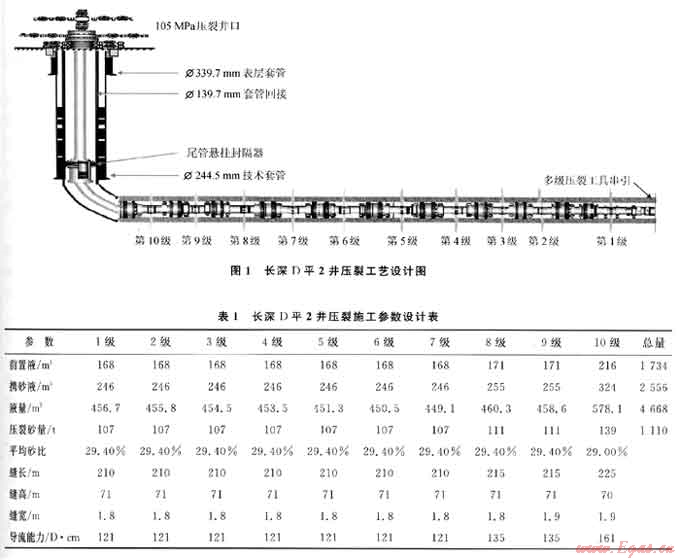 長深D平2井壓裂施工歷時(shí)3d,創(chuàng)造了中國石油壓裂史上的3項(xiàng)紀(jì)錄:①水平井深層氣井壓裂級數(shù)最多(10段);②單井總壓裂規(guī)模最大(838m3);③單級壓裂規(guī)模最大(116m3)(圖3)。