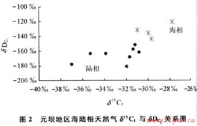 根據前人對甲烷氫同位素的研究,通常認為烷烴氣的氫同位素首先制約于沉積環(huán)境,其次才是成熟度的影響。Schoell提出天然氣氫同位素組成隨烴源巖熱演化程度的增加變重,陸相淡水環(huán)境生成的熱成因甲烷的氫同位素組成小于-190‰,海相環(huán)境生成的甲烷的氫同位素組成大于-190‰[1]。沈平等研究發(fā)現中國陸相盆地天然氣甲烷的氫同位素組成介于-255‰~-158‰,其中海陸交互相的半咸水環(huán)境中生成的甲烷氫同位素值(δD)亦大于-190‰,而湖相、沼澤相的淡、微咸水環(huán)境生成的生物甲烷δD值一般小于-200‰[2~5]。王曉峰等對塔里木盆地海相和陸相環(huán)境生成的天然氣甲烷氫同位素進行研究后發(fā)現,二者基本以-170‰為界[3~6]。錢志浩等認為,四川盆地天然氣由于成熟度和共存水的影響,海陸相天然氣甲烷8D的劃分界限以-160‰為宜[6]。