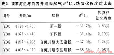 總體上,自流井組珍珠沖段、東岳廟段及大安寨段天然氣組分特征與須家河組相比較具有干燥系數低、重烴含量高的特點,且自流井組天然氣甲烷碳同位素值比須家河組更輕,由化驗分析結果結合地質特征,自流井組天然氣熱演化程度比須家河組要低(表3)。例如,YB03井東岳廟段(4035~4110m)天然氣組成中甲烷含量為91.79%,重烴含量為6.257%,干燥系數C1/C1-5=0.936,屬于偏干的濕氣,相當于高成熟階段天然氣。天然氣甲、乙、丙烷系列碳同位素值依次變重,且甲烷碳同位素值相對較輕,反映原地生成而且具有全捕獲的特征,也即聚集了低演化至目前高成熟階段的全系列天然氣,具有典型原地成藏的天然氣地球化學特征(表1、2)。