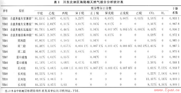 首先,長興組天然氣表現出特別干燥的特征,干燥系數大(一般大于0.999)。甲烷含量高,除甲烷、乙烷外,丙烷以上組分含量甚微或者不含。而陸相天然氣,尤其是自流井組天然氣相對較濕,部分天然氣干燥系數達0.93,表現出較濕的特征,含有少量的戊烷以上等重烴組分(表1)。雷口坡組與須家河組天然氣特征接近,干燥系數均介于上述兩者之間,表現出相對較干燥特征,甲烷含量超過95%,乙烷以上等重烴含量很低,基本不含戊烷等以上重烴。