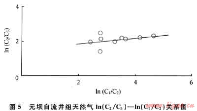 自流井組天然氣ln(C2/C3)值變化很小(處于數值2附近),在ln(C2/C3)—ln(C1/C2)關系圖上基本呈一水平直線;而ln(C1/C2)值變化較大(介于2~5)。由此,可以判斷元壩地區(qū)自流井組天然氣主要屬于干酪根裂解氣類型(圖5)??紤]到元壩地區(qū)自流井組天然氣相對較濕、重烴含量較高的特點及地質特征,綜合研究認為該區(qū)可能存在少量的原油二次裂解氣。