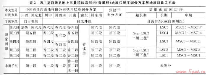 由于控制四川盆地構(gòu)造-沉積格局的龍門山和米倉山-大巴山兩條造山帶逆沖推覆活動(dòng)的非同步性和異方位性[5~6],須家河期的沉積充填作用于盆地各部位也是不同步和非均衡的,在地層表現(xiàn)形式上,如地層厚度、巖性、巖相、疊置方式和物源供給方向都存在很大的差異性,致使盆地范圍內(nèi)須家河組很難進(jìn)行統(tǒng)一地層劃分和區(qū)域?qū)Ρ?。但依?jù)上述各次級(jí)構(gòu)造單元須家河組層序發(fā)育特征,筆者采用高分辨率層序地層學(xué)理論和層序分析與對比技術(shù)[19],從盆-山耦合過程的構(gòu)造-沉積序列分析和旋回等時(shí)對比法則入手,在對各次級(jí)構(gòu)造單元須家河組進(jìn)行層序劃分和發(fā)育特征描述的基礎(chǔ)上,建立貫穿盆地的層序 地層和時(shí)間-地層格架,從層序演化規(guī)律和旋回等時(shí)性分析角度出發(fā),對須家河組進(jìn)行了更為合理的統(tǒng)一劃分和區(qū)域地層對比取得較好效果(表2),也為編制須家河組更精細(xì)的層序-巖相古地理圖[16]和描述層序充填樣式與氣藏分布關(guān)系[20]提供了更為有效的基礎(chǔ)資料。