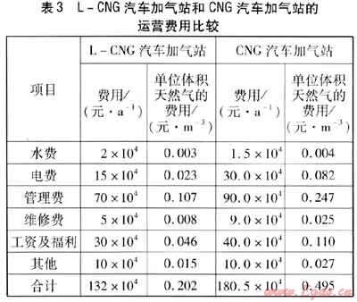 L-CNG汽車加氣站與CNG汽車加氣站的運(yùn)營(yíng)費(fèi)用比較見(jiàn)表3。