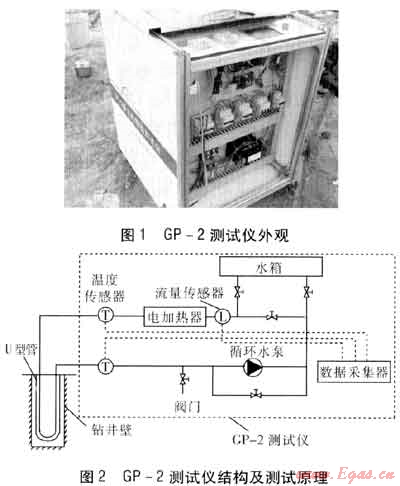 目前的測(cè)試裝置均是以擾動(dòng)-響應(yīng)的方式來推算地下的換熱情況和巖土體熱物性參數(shù)。本次試驗(yàn)的測(cè)試裝置是中國(guó)地質(zhì)大學(xué)(武漢)工程學(xué)院研制的GP系列測(cè)試儀(GP-2),測(cè)試儀外觀見圖1,測(cè)試儀結(jié)構(gòu)及測(cè)試原理見圖2。GP-2測(cè)試儀的測(cè)試原理:在鉆孔中埋設(shè)U型管并回填[4],使U型管與測(cè)試儀管路連接,形成一個(gè)閉合回路。在循環(huán)水泵的作用下,水通過電加熱器加熱升溫后進(jìn)入U(xiǎn)型管,將熱量傳遞給周圍的巖土體,最后流回到測(cè)試儀中。通過測(cè)試,獲得U型管的進(jìn)、出水溫度和流量,用以計(jì)算巖土體的熱物性參數(shù)。