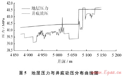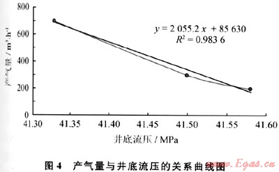 圖4所示的是某井在5087m處地層壓力測試所得產(chǎn)氣量與井底動壓的關系曲線。根據(jù)MWD實測資料,5087m處實測垂深為4105m,則可計算出地層壓力系數(shù)為1.034,回歸計算結果與完鉆測試解釋結果吻合。