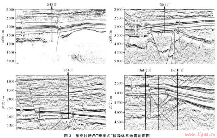 “斷接式”輸導(dǎo)樣式在該區(qū)大量發(fā)育(圖2),對于“多期、多源”油氣運聚具有積極意義。首先,解決了油氣的垂向輸導(dǎo),尤其是對于存在膏巖層且鹽下缺乏有利圈閉的區(qū)域,“斷接式”輸導(dǎo)可以允許油氣穿透膏巖層在上部層位聚集成藏;其次,促進了油氣的次生調(diào)整,使次生油氣源沿“斷接式”輸導(dǎo)向上部匯聚,有利于次生油氣藏的形成。