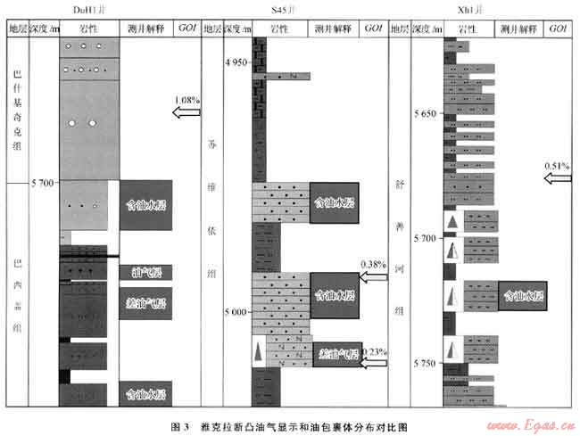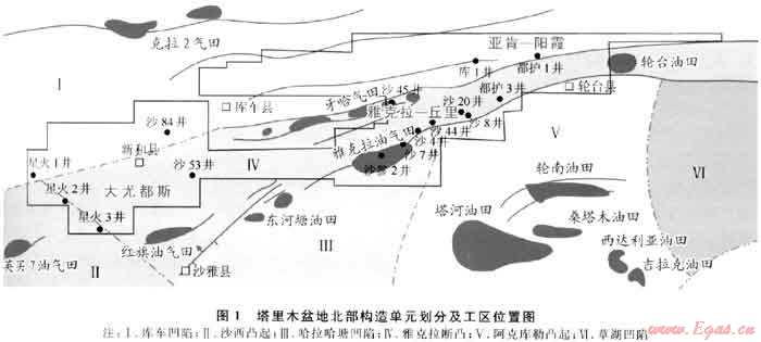 塔里木盆地在地質(zhì)歷史中經(jīng)歷了多期構(gòu)造運動交替,表現(xiàn)出典型疊合盆地多旋回構(gòu)造運動復(fù)雜控油過程。在這一背景下,前人對雅克拉斷凸成藏過程進行了大量研究并提出了多種成藏模式[1~2],但是成藏期次和時間的厘定多建立在對成藏條件定性分析的基礎(chǔ)上,缺乏直接手段;同時,未根據(jù)該區(qū)不同來源油氣運移的差異,建立不同的輸導(dǎo)模式。為此,筆者運用流體包裹體系統(tǒng)分析方法,通過對雅克拉斷凸白堊-古近系系統(tǒng)采樣樣品的測試所獲取的油氣充注期次信息,同時結(jié)合工區(qū)烴源巖生排烴史、油氣顯示和輸導(dǎo)體系研究成果,來探討雅克拉斷凸油氣成藏過程。
